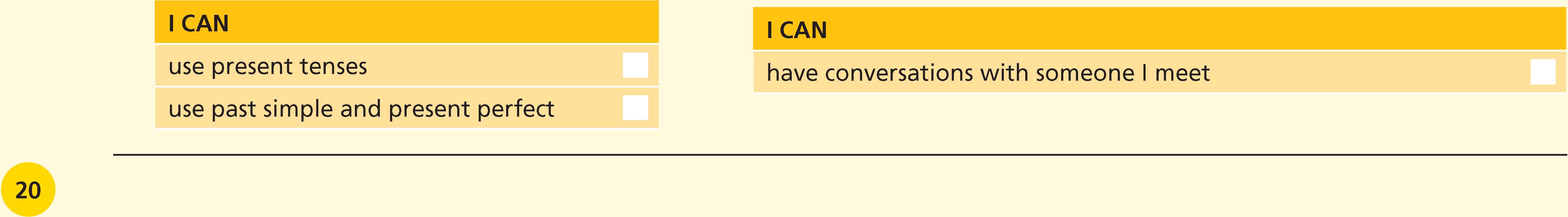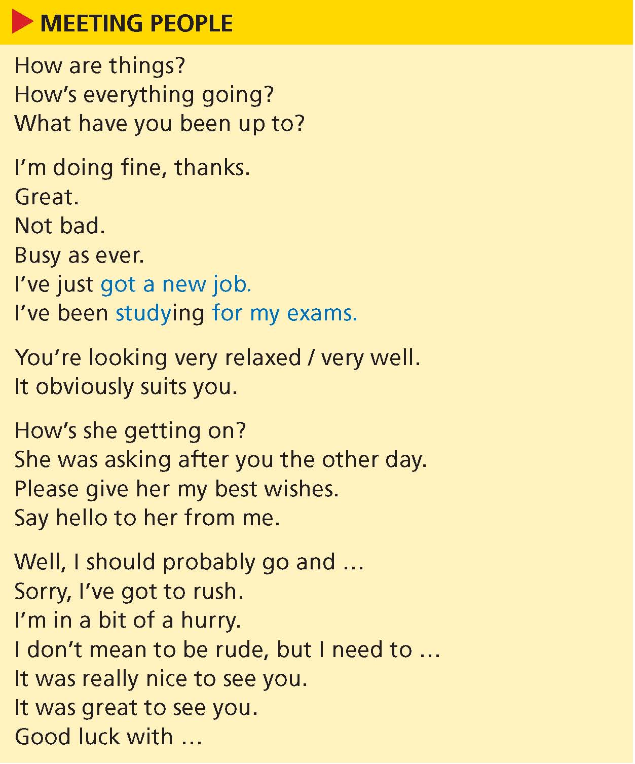 1 How are things? 2 How’s everything going? 3 What have you been up to? 4 I haven’t seen you for ages. 5 6 7 8 4 Match the expressions you ticked in Exercise 3 b Work in pairs. Practise saying the common
