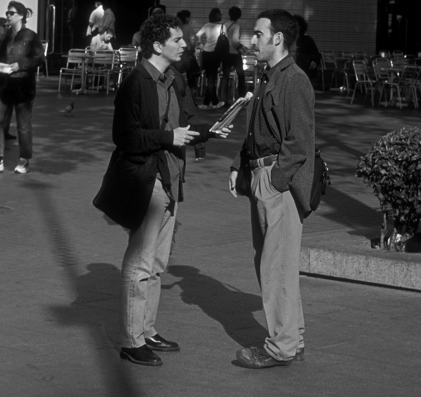 Listen to comments where someone meets a friend by chance in the street.